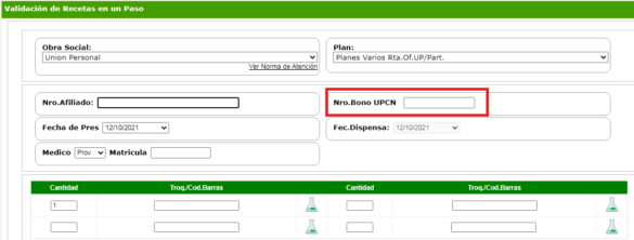 INTEGRAL GILSA (ex OSPOCE Integral) – Plan Autorizados -Nuevos porcentajesLa Obra Social informa que, a partir del día lunes 25 de octubre del corriente año, se incorporan nuevos porcentajes de Autorización, manteniendo los mismos requisitos que el resto de los planes autorizados. -Para ver Norma de Atención (Clic aquí). OSPIA – Nuevo Plan Autorizados 40%Se informa que, a partir del día lunes 25 de octubre del corriente año, se incorpora un nuevo porcentaje de Autorización, denominado “Plan Autorizados 40%”, manteniendo los mismos requisitos que el resto de los planes autorizados. -Para ver Norma de Atención (Clic aquí). UNIÓN PERSONAL – Bono UPCN - Validación ObligatoriaColegas, informamos que, a partir del día lunes 25 de octubre del corriente año, se pondrá en vigencia la validación obligatoria del Bono de UPCN (30%). El mismo, actuará únicamente como descuento adicional para el convenio UNIÓN PERSONAL. Para el cobro, se deberá presentar el Bono junto a la receta de UNIÓN PERSONAL, con el resto de las recetas, ya que la validación se genera en conjunto con la de UNIÓN PERSONAL. Es importante aclarar que el Bono puede estar en blanco, pero debe contener la fecha de dispensa, la firma y datos del Afiliado o tercero más el comprobante de Validación. -Para ver modelo del Bono UPCN (Clic aquí). Al momento de validar el Bono, se deberá cargar el número del mismo en el campo resaltado en Rojo, como se observa en la siguiente imagen. Es importante aclarar que la validación de U.P y el Bono de UPCN, se realiza en forma conjunta, dando la cobertura de ambos en el mismo comprobante de validación.
